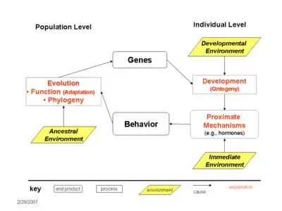 Evolution, which is determined by both function and phylogeny, results in the genes of a population. The genes of an individual interact with its developmental environment, resulting in mechanisms, such as a nervous system. A mechanism (which is also an end-product in its own right) interacts with the individual's immediate environment, resulting in its behaviour.