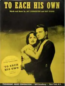 "To Each His Own" is a popular song with music written by Jay Livingston and lyrics by Ray Evans. It is the title song of the movie of the same name and was published in 1946 by Paramount Music. The duo were assigned to write this song after film composer Victor Young turned it down.[3]