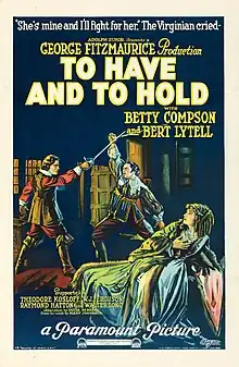 To Have and to Hold is a 1922 American silent historical drama film. Based on the 1899 novel of the same name, the film was directed by George Fitzmaurice and starred Bert Lytell and Betty Compson.