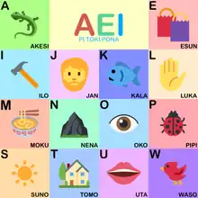 Fourteen Latin letters, a e i j k l m n o p s t u w, are used to write the language. They have the same values as in the International Phonetic Alphabet:[2] j sounds like English y (as in many Germanic and Slavic languages) and the vowels are like those of Spanish, Modern Greek, or Modern Hebrew. Capital initials are used to mark proper nouns, while Toki Pona roots are always written with lowercase letters, even when they start a sentence.[2][3] Besides the Latin alphabet, which is the most common way of writing the language, many alternative writing systems have been developed for and adapted to Toki Pona.[2] Most successful and widespread are two logographic writing systems, sitelen pona and sitelen sitelen. Both were included in the book Toki Pona: The Language of Good.