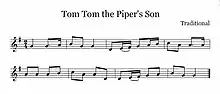 "Tom, Tom, the Piper's Son" is a popular English language nursery rhyme. It has a Roud Folk Song Index number of 19621.