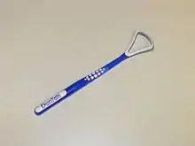 A tongue cleaner (also called a tongue scraper or tongue brush) is an oral hygiene device designed to clean the coating on the upper surface of the tongue. While there is tentative benefit from the use of a tongue cleaner it is insufficient to draw clear conclusions regarding bad breath.[1]