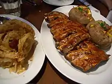 When the first Tony Roma's opened in the 1970s, the restaurant was known for its burger and steaks until chef David Smith cooked up some baby back ribs and they became popular.[6] Today the menu includes ribs, burgers, and steaks, as well as chicken and seafood dishes, appetizers, vegetarian dishes, desserts, and a cocktail list. Many international locations provide additional options that conform to local customs.[12] Tony Roma's menu is routinely updated with specials, new chef-created dishes, and seasonal cuisines.[13] In 2015, Roma Corp's introduced a new concept, TR Fire Grill & Lounge, in Orlando, Florida, featuring modern American cuisine and modern cocktails.[14][15]