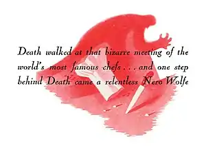 Wolfe is the last contestant to taste the dishes, but halfway through he summons Archie into the private dining room where the tasting is taking place; Philip Laszio has been murdered, stabbed in the back and hidden behind a room divider. The authorities are called, led by Barry Tolman, a local prosecutor who happened to arrive on the train with Wolfe and Goodwin. At Wolfe's suggestion, Tolman examines the results of the taste testing, on the theory that the murderer, either tense before committing murder or shaken afterwards, would be unable to determine accurately the missing ingredients. Jerome Berin has the lowest score and, based on Wolfe's theory, he is subsequently charged with murder. This drives a wedge between Tolman and Constanza Berin, Jerome's daughter, who have been developing a romantic attachment.