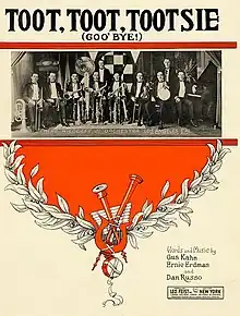 Toot, Toot, Tootsie (Goo' Bye!) is a 1922 song with music and lyrics by Gus Kahn, Ernie Erdman and Danny Russo,[1] per the credits on the original sheet music cover. Some other sources also credit Ted Fio Rito and Robert King for the song, but make no mention of Dan Russo.[2] It debuted in the Broadway musical Bombo, where it was a major hit. It was first recorded by Al Jolson with Frank Crumit's orchestra for Columbia Records on September 9, 1922.[3] It was further popularised by the racy singer-comedian Eddie Cantor.[4][5]