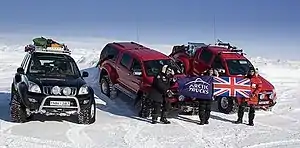 Clarkson and May's modified Hilux, a second Hilux and a Toyota Land Cruiser for the film crew started in December 2006.[2] During the vehicle testing phase, the presenters were sent to Kaprun, Austria for cold-weather training by a former Royal Marines Reservist,[3] who taught them basic survival skills. Before departure, they spent a further two nights of survival training out on the sea ice in Canada. Due to their constant tomfoolery, they were shown sobering images of the dangers of freezing weather and received a stark warning of the dangers they faced from polar explorer Ranulph Fiennes.