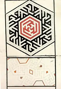 Some of the patterns show the application of geometric principles to Islamic traditions. For example, the word Muhammad (Muḥammad ibn ʿAbd Allāh) is repeated six times along the sides of the hexagon, and the word Ali (Alī ibn Abī Ṭālib) three times in a rotating wise in the inner hexagon.[7]
