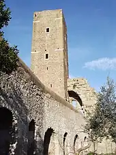 The Tor Fiscale dates back to the 13th Century, with the first written record from 1277. It is situated at one of the two crossing points of the Claudia and Marcia aqueducts. The tower is square and is made of tuff, with a few rows of bricks, and small rectangular windows. On the west side there is a small depressed arch, built, perhaps, to relieve the weight of the wall above the foundations of the aqueducts. The tower was originally surrounded by a rampart, remains of which could be seen until the mid-twentieth century.[1] It originally served as a watch tower, as part of a small castle owned by the Annibaldi family.[2] The name of Fiscale attributed to the tower appears not to come from a tax-collecting function, as was one role of the nearby Tomb of Caecilia Metella on the Appian Way, but from the fact that at one time the estate belonged to the Papal Treasurer.