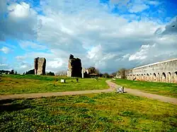 The area of the park was suitable to be transformed into a fortified zone, which could be used to control both the Via Latina and the Appian Way. This was first done by the Ostrogoths during the Siege of Rome (537–38) in the early years of the Gothic War (535–554). They closed in the arches of the aqueducts to provide a fortified camp, enabling them to block the flow of supplies to the city via the Via Appia and the Via Latina. They also interrupted the flow of water to the city by severing the aqueducts.[2] Subsequently, the area took on the name of Campus Barbaricus. Its strategic importance meant that it continued to be used by invading armies. For example, in 1084 the troops of Robert Guiscard, who had come to the aid of Pope Gregory VII in his struggle with the Holy Roman Emperor Henry IV, pitched their camp in this area.[1]