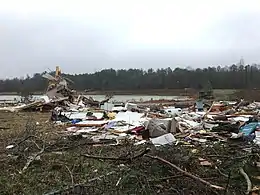 EF2 Lake Village, AR to W of Metcalfe, MS Chicot (AR), Washington (MS) AR, MS 33°20′06″N 91°18′46″W / 33.3349°N 91.3129°W / 33.3349; -91.3129 (Lake Village (Jan. 11, EF2)) 09:33–09:53 17.66 mi (28.42 km) 850 yd (780 m) A strong tornado crossed the state line between Mississippi and Arkansas three times. It began at an airport, rolling and largely destroying a manufactured home, and downing electrical power poles. A golf country club suffered damage, a trailer was blown across a street, and the second floor was blown off a lake house. Numerous trees were snapped or uprooted, and one fallen tree on a house caused an injury.[61]