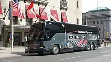 The Airport Express used H345 Prevost Car 45' motor coaches with seating for 56. They were powered by engines that produce 55 per cent less nitrogen oxide and 90 per cent less particulate matter than the previous models.[6] The coaches also come with improved features including such as leather seats, free WiFi internet, laptop plugs and retractable seat belts.[7]