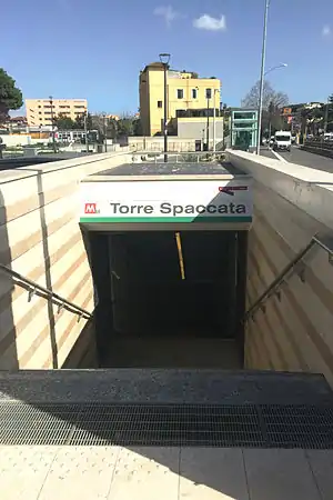 Torre Spaccata is an underground station of Line C of the Rome Metro. It is located at the intersection of the Via Casilina with Via di Torre Spaccata and Via di Tor Tre Teste. The stop serves the areas of Torre Spaccata, Alessandrino and Tor Tre Teste. Construction of the station started in 2007, and it was opened on 9 November 2014.[1]