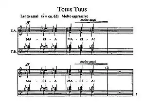 Totus Tuus Op. 60 (English: Totally Yours) was written for unaccompanied mixed choir by the Polish composer Henryk Górecki in 1987. Górecki composed the piece to celebrate Pope John Paul II's third pilgrimage to his native Poland that summer,[1][2] and the work remains his best-known, if not critically acclaimed, a cappella choral piece of the 1980s.[3] Indeed, Totus Tuus has been described as a contemporary classic (Wordsworth 2013, p. 49).