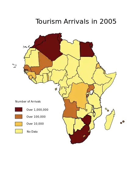 All of the data presented here is from the World Tourism Organization (UNWTO) and from "Reviewing Africa in the Global Tourism Economy."[24] The following table shows the number of arrivals in each country: