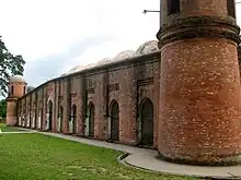 Lalbagh Fort is an incomplete 17th century Mughal fort complex in Dhaka, Bangladesh.[24] This fort (also known as Fort Aurangabad)stands proudly before the Buriganga River in the southwestern part of Dhaka, Bangladesh.[1] The construction was started in 1678 AD by Mughal Subahdar Muhammad Azam Shah. For long the fort was considered to be a combination of three buildings (the mosque, the tomb of Bibi Pari and the Diwan-i-Aam), with two gateways and a portion of the partly damaged fortification wall. Recent excavations carried out by the Department of Archaeology have revealed the existence of other structures.