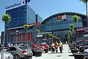 | The Mall | The Mall, Sofia, is the largest shopping mall in Bulgaria. Opened in spring 2010 by Prime Minister Boyko Borisov, the Mall has a total built area of 65,000 square metres (700,000 sq ft) on six storeys, three of which are underground. It contains 185 shops, restaurants, recreations centres, bars, cafeterias and parking capacity for more than 2,800 vehicles. Bulgaria's largest Carrefour hypermarket at 9,000 square metres (97,000 sq ft) is within the Mall. The Mall can be found at 115 Tsarigradsko Shose. | ![]() |