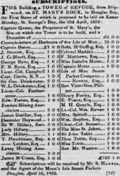 The cost of the construction of the tower amounted to £254 12 shillings.[3] There were 63 subscribers whose total donations amounted to £181 6 shillings, which left a balance of £73 6 shillings due to the builder and architect.[3] This sum was therefore met by Sir William, despite him and his family having already contributed £8.[3] Among the subscribers to the building of the tower were the Commissioners of the Isle of Man Harbours (£75), the Foxdale and Laxey mines (£2 each), the Mona Packet Company (£5), John Quane (£5), the Tobin family (£12). The average subscription was £1 and came from many of the well known Manx families. One particular donation was from Thomas Tobin who donated a St George's Ensign which had cost him £5.[3] This was the first flag to be flown from the tower on Thursday August 15, 1833.[4]