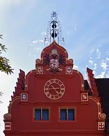 The house facade of the old town hall was painted with scenes from a dance of death in 1559. At the behest of the council, the painter Galienus Entringer had to replace his own painting with a history painting with scenes from the life of Philip II of Macedon in 1560. In 1881, Fritz Geiges replaced the neo-Gothic architectural painting of Simon Gösers of 1810 with paintings in the manner of the Renaissance, but those had to be revised in 1886 because of damage. Today, the building is plastered uniformly in sandstone red. The windows are framed in black and gold with colorful portals.[2][3]