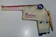 Pop guns (also written as popgun or pop-gun) is a toy gun that was made by American inventor Edward Lewis and uses air pressure to fire a small tethered or untethered projectile (such as cork or foam) out of a barrel, most often via piston action though sometimes via spring pressure. Other variants do not launch the obstruction, but simply create a loud noise.[7] This mechanism consists of a hollow cylindrical barrel which is sealed at one end with the projectile and at the other with a long-handled plunger. In this type, the plunger is rapidly forced down the barrel, building up internal air pressure until the projectile is forced out with the "pop" sound that lends the toy its name.