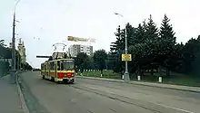 The Vinnytsia Tramway (Ukrainian: Вінницький Трамвай, translit.: Vinnytskyi Tramvai) network is the part of the public transportation system that since 1913 serves Vinnytsia, the administrative center of the Vinnytsia Oblast, Ukraine. The tram system has a narrow rail gauge of 1,000 mm (3 ft 3+3⁄8 in) that only exists in Ukraine in the cities of Lviv, Zhytomyr and Yevpatoria, as well as Vinnytsia. The system currently consists of 21.2 km of tracks.[1]
