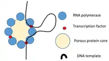 The structure of a transcriptional factory directly relates to its function. Transcription is made more efficient because of the clustered nature of the transcription factory. All the necessary proteins: RNA polymerase, transcription factors and other co-regulators are present in the transcription factory that allows for faster RNA polymerisation when the DNA template reaches the factory, it also allows for a number of genes to be transcribed at the same time.[6]