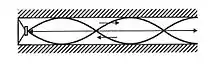 The concept was innovated within acoustic enclosure design, and originally termed an "acoustical labyrinth", by acoustic engineer and later Director of Research, Benjamin Olney, who developed the concept at the Stromberg-Carlson Telephone Co. in the early 1930s while studying the effect of enclosure shape and size on speaker output, including the effect of "extreme length in a box baffle".[13] A patent was filed in 1934.[14] The design was used in their console radios beginning in 1936.[15] A loudspeaker enclosure based on the concept was proposed in October 1965 by Dr A.R. Bailey in Wireless World magazine, referencing a production version of an acoustic-line enclosure design from Radford Electronics Ltd.[16] The article postulated that energy from the rear of a driver unit could be essentially absorbed, without damping the cone's motion or superimposing internal reflections and resonance, so Bailey and Radford reasoned that the rear wave could be channelled down a long pipe. If the acoustic energy was absorbed, it would not be available to excite resonances. A pipe of sufficient length could be tapered, and stuffed so that the energy loss was almost complete, minimizing output from the open end. No broad consensus on the ideal taper (expanding, uniform cross-section, or contracting) has been established.