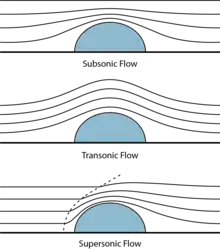 Transonic (or transsonic) flow is air flowing around an object at a speed that generates regions of both subsonic and supersonic airflow around that object.[1] The exact range of speeds depends on the object's critical Mach number, but transonic flow is seen at flight speeds close to the speed of sound (343 m/s at sea level), typically between Mach 0.8 and 1.2.[1]