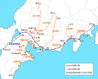 The passenger rail network in Greater Nagoya is fairly dense with 3 million passengers daily (1.095 billion annually).[2] Passenger railway usage and density is lower than that of Greater Tokyo or Greater Osaka, as generally the trend in Japan, few free maps exist of the entire network, operators show only the stations of their respective company and key transfer points. In addition to above-ground and below-ground rail lines, the Tōkaidō Shinkansen serves as the backbone of intercity rail transport. The Chuo Shinkansen is planned to pass through Nagoya.