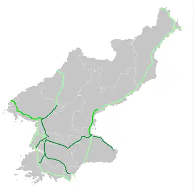 This article incorporates text from this source, which is in the public domain. Savada, Andreas Matles, ed. (1994). "North Korea: A Country Study". Country Studies. Federal Research Division. Retrieved 27 July 2013.{{cite encyclopedia}}: CS1 maint: multiple names: authors list (link) CS1 maint: numeric names: authors list (link) Fourth ed. Washington: Federal Research Division of the Library of Congress. ISBN 0-8444-0794-1. - ↑ "North Korea: Transportation". CIA World Factbook. Retrieved July 13, 2013.