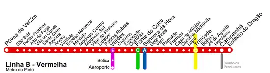 Line B of Porto Metro links Póvoa de Varzim to Porto and the airport with two services: a standard and a shuttle (the Expresso). Through Verdes station, Metro trains link the city and the airport. This waiting station to reach Póvoa de Varzim is a small public park near the airport, and it literally means the green park station.[4] The line operates on a former railway, which opened in 1875 and closed in 2002 to give way for the metro. The railway network was expanded and reached Famalicão in 1881, it was closed entirely in 1995 due to an accident with a bus and became a rail trail.[5]