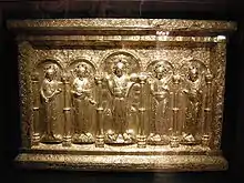 The Antependium of Basel is a golden altar frontal donated by emperor Henry II, possibly in the year 1019. It is considered to be one of the masterpieces of Ottonian art. The Antependium is a thin golden plate on an oak wood wood base, 120 cm high and 178 cm wide. It is decorated with repoussé images of five figures standing in arcades: Saint Benedict of Nursia, the archangel Michael, Christ the Salvator and the archangels Gabriel and Raphael. Small figures of Emperor Henry and his wife Cunigunde are crouching and praying at the feet of Christ. In the spandrels above, amongst dense foliage containing grapes, pomegranates, birds and mammals, the four cardinal virtues are represented.