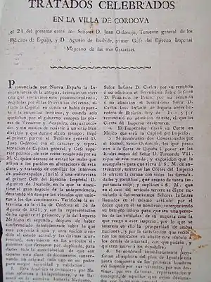 The Treaty of Córdoba established Mexican independence from Spain at the conclusion of the Mexican War of Independence. It was signed on August 24, 1821 in Córdoba, Veracruz, Mexico. The signatories were the head of the Army of the Three Guarantees, Agustín de Iturbide, and, acting on behalf of the Spanish government, Jefe Político Superior Juan O'Donojú. The treaty has 17 articles, which developed the proposals of the Plan of Iguala.[1] The Treaty is the first document in which Spanish (without authorization) and Mexican officials accept the liberty of what will become the First Mexican Empire, but it is not today recognized as the foundational moment, since these ideas are often attributed to the Grito de Dolores (September 16, 1810). The treaty was rejected by the Spanish government, publishing this determination in Madrid on February 13 and 14, 1822.[2]