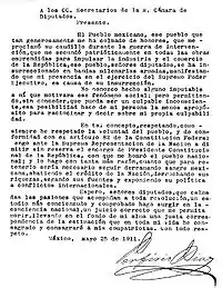 The moderate view within the Díaz government was represented by Jorge Vera Estañol, who in a memo to the minister of foreign affairs wrote that there were two revolutions taking place in Mexico: a political revolution, based mostly in the north whose main aim was to establish free elections and remove Díaz himself from power, and a social revolution whose aim was "anarchy", which was spreading throughout the countryside.[2] Estañol recommended coming to terms with the first group of revolutionaries by agreeing to the principle of no re-election and a general amnesty, in order to prevent the second group from succeeding.[2] In addition to his fear of "anarchy", Estañol was also worried that the social revolution would lead to a military intervention by the United States.[2]