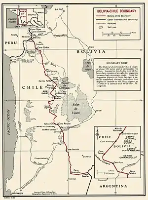 - ↑ At the time of the treaty of 1904, a permanent boundary had not been established between Peru and Chile, and the latter administered the Arica - Tacna area. Therefore, the Bolivia-Chile boundary was delimited northward of the present Peru tripoint as follows: