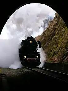 The Polish railway was very heavily used. An average of 420 German military trains were passing through every 24 hours on top of internal traffic already in 1941.[91] The Holocaust trains passage to their destination was routinely delayed; some transports took many days to arrive.[92] Hundreds of prisoners were murdered by exhaustion, suffocation and thirst while in transit to the camp in the overcrowded wagons.[93] In extreme cases, such as the Biała Podlaska transport of 6,000 Jews travelling only a 125 km (78 mi) distance, up to 90 percent of people were already dead when the sealed doors were opened.[92] From September 1942 on, both Polish and foreign Jews were greeted with a brief verbal announcement. An earlier signboard with directions was removed because it was clearly insufficient.[94] The deportees were told that they had arrived at a transit point on the way to Ukraine and needed to shower and have their clothes disinfected before receiving work uniforms and new orders.[75]