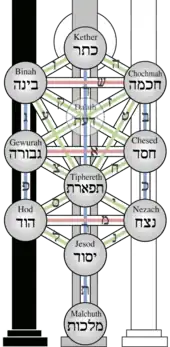 The diagram is also used in Christian Kabbalah, Hermetic Qabalah, and Theosophy.[7][2][12] The nodes are also associated with deities, angels, celestial bodies, moral values, single colors or combinations of them, and specific numbers.[10][7]