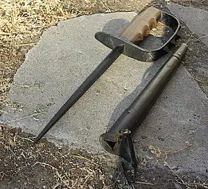 With the exception of the German Nahkampfmesser (or close combat knife),[4] most early trench knives were fabricated by hand by individual soldiers or blacksmiths for the purpose of silently killing sentries and other soldiers during trench raids.[6] These early "trench knives" were often shortened and sharpened Army-issue bayonets. One type of stabbing weapon, the French Nail, was made by cutting and pointing the steel stakes used to support the barbed wire protecting trenches. Some historians say that some trench knives models were inspired by the Bowie knife.[7]