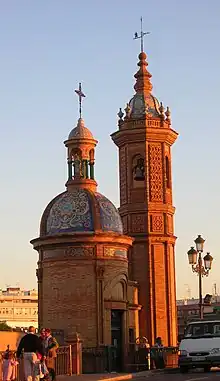 Triana is connected to Seville by the Isabel II bridge (popularly known as Puente de Triana) constructed between 1845 and 1852 by Gustavo Steinacher and Ferdinand Bennetot. It has on its west side a small Neo-Mudéjar chapel built by Aníbal González in 1927; both together constitute the most recognised symbol of the neighborhood. They were declared a national monument in 1976 after a proposal to demolish them was defeated.[4][5] The Triana market, built in 2005 in the Moorish Revival style, is located on the southern side of the bridge. The foundations of the Castillo de San Jorge may be seen in the basement of this building,[6] which is now home to educational exhibits relating to the history of the Inquisition.[7]
