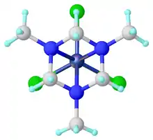 Structure of (Me3TACH)ScCl3 viewed down the three-fold symmetry axis (color scheme: blue = N, green = Cl, gray = C).[6]
