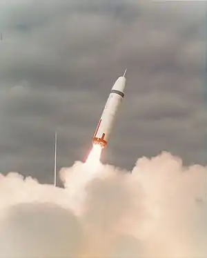 The Trident missile is a submarine-launched ballistic missile (SLBM) equipped with multiple independently targetable reentry vehicles (MIRV). Originally developed by Lockheed Missiles and Space Corporation, the missile is armed with thermonuclear warheads and is launched from nuclear-powered ballistic missile submarines (SSBNs). Trident missiles are carried by twelve [1] United States Navy Ohio-class submarines, with American warheads, as well as four Royal Navy Vanguard-class submarines, with British warheads. The missile is named after the mythological trident of Neptune.[2]