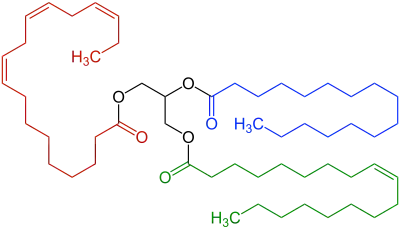 Example of a natural mixed triglyceride with residues of three different fatty acids. The first fatty acid residue is saturated (blue highlighted), the second fatty acid residue contains one double bond within the carbon chain (green highlighted). The third fatty acid residue (a polyunsaturated fatty acid residue, highlighted in red) contains three double bonds within the carbon chain. All carbon-carbon double bonds shown are cis isomers.