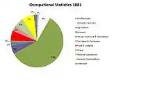 By 1811, the census shows that the population of the parish was 346, with 175 males and 171 females. In the village, 35 families were chiefly employed in agriculture, 17 in trade/manufacture and the remaining 19 families were unknown or not recorded.[6] There is more data on occupations in 1881. The breakdown for the males was 57 in agriculture, 7 in general commodities, 7 in domestic services/offices, 6 in food and lodging and 5 working with animals. In contrast, 26 females worked in domestic services and offices and the occupation of the remaining 76 was not stated.[7] The population of Trimley St Mary has continued to grow since records began in 1801, when the population was only 330.[8] By 2011, it had reached 3,665.[9] The 2011 census showed that employment in Trimley has altered greatly. The percentage working in agriculture has declined to less than 1% of the working population. The biggest increases have been seen in manufacturing, wholesale, retail, transport, storage and education.[10] This parallels the general trend of change throughout the rest of England, where the agricultural industry has seen large declines, along with most industries of the primary sector of the economy as people have moved over to the secondary and tertiary sectors in hope of greater pay and better conditions in the workplace.[11]