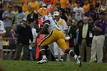 Holliday was a top-ranked American sprinter competing for the LSU Tigers track and field team and is regarded as one of the fastest players in football.[2] He demonstrated his sprinting ability in the 100-meter dash at the 2007 USA Outdoor Track and Field Championships, where he recorded 10.07 seconds in the final – ahead of Walter Dix and second only to Tyson Gay.[5] This qualified him for the 2007 World Championships in Athletics but he opted to not compete, preferring to begin the football season with the LSU Tigers.[6] He continued to race, however, and reached the semi-finals in the 100 m at the 2008 United States Olympic Trials the following year.[7]
