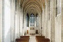 The Trinity College Chapel was built with funds donated by Gerald Larkin, head of the Salada Tea Company from 1922 to 1957. It was designed in the modified perpendicular Gothic style by renowned English architect Giles Gilbert Scott, who was also responsible for the Liverpool Cathedral and the ubiquitous red telephone boxes seen throughout Britain.[105] The chapel extends 100 feet (30 m) to the reredos and is 47 feet (14 m) high at the vault bosses.[99] Using only stone, brick, and cement, Italian stonemasons employed ancient building methods; the only steel in the construction is in the hidden girders supporting the slate roof, with the exterior walls being sandstone. The Chapel contains several architectural sculptures, including a tympanum by Emmanuel Hahn as well as a carved lintel and tympanum by Jacobine Jones, who also carved the wooden angels on the baptistry. The Lady Chapel's altar was preserved from the original Queen Street location chapel, while the matching sedilia was donated by Robertson Davies' widow in his memory.[106] In the chapel a memorial tablet in Indiana limestone designed by Allan George, with lettering and medallions by A. Scott Carter, is dedicated to the members of Trinity College who gave their lives in the First and Second World Wars.[107] A number of bronze memorial plaques also honour alumni who died during the First World War.[108] On the wall outside the entrance to the chapel, a memorial Triptych illuminated manuscript in three frames is an Honour Roll erected by Trinity College in 1942 dedicated to the approximately 1000 men and women of Trinity College who died while serving their country; Canadian artist Jack McNie completed the lettering by hand.[109]