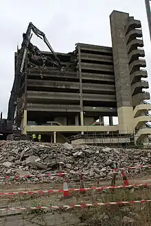In June 2007, Gateshead Council and site owners Tesco confirmed the demolition of the car park.[7] The shops in the shopping centre below closed at the end of January 2008, in readiness for the demolition, and a final tour of the upper levels was held by the owners of the site in April 2008. Demolition of the buildings surrounding the car park was started at the end of 2008 by demolition contractor, Thompsons of Prudhoe. By 2010, the car park structure remained, although the shopping centre buildings around had been demolished. Demolition of the car park itself finally commenced on 26 July 2010, with Owen Luder stating that Gateshead would lose its "front teeth".[8]