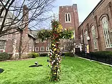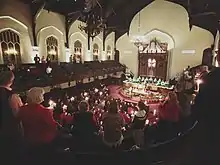 The interior of the original church included a grand auditorium, three classrooms, a minister's study, a trustees' meeting room, and a 36-by-68 foot lecture room on the second floor (later called Craig Hall).[4] In the 1920s Trinity added a Tudor-style wing containing classrooms, offices, a kitchen, and full gymnasium.[3]