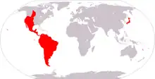 Triops longicaudatus is widespread in North America. In Canada, it is found only in the provinces of Alberta, Saskatchewan and Manitoba.[7] It is widespread throughout the contiguous United States, Mexico, and Hawaii, but not Alaska. Tadpole shrimps may be found in parts of South America (Argentina and Galápagos Islands),[8] in the West Indies, and the Pacific Islands, including Japan and New Caledonia.[9]