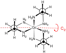 The point group of this complex is D3. The complex can be resolved into enantiomers that are described as Δ and Λ. Usually the resolution entails use of tartrate salts.[4] The optical resolution is a standard component of inorganic synthesis courses.[5] Because of its nonplanarity, the MN2C2 rings can adopt either of two conformations, which are described by the symbols λ and δ. The registry between these ring conformations and the absolute configuration of the metal centers is described by the nomenclature lel (when the en backbone lies parallel with the C3 symmetry axis) or ob (when the en backbone is obverse to this same C3 axis). Thus, the following diastereomeric conformations can be identified: Δ-(lel)3, Δ-(lel)2(ob), Δ-(lel)(ob)2, and Δ-(ob)3. The mirror images of these species of course exist also.[6]