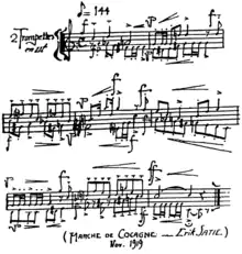 In November 1919, the young cookery historian Bertrand Guégan[7] asked Satie to set a poem to music for his Almanach de Cocagne (Cockaigne Almanac), an annual publication "dedicated to true gourmets and serious drinkers."[8] Satie claimed the deadline was too short for him to do the job properly and instead submitted a brief fanfare-like march for 2 trumpets, giving it the title Marche de Cocagne. As musical fanfares had been used to announce the courses of luxurious French banquets since the Middle Ages,[9][10] his offering was in keeping with the gastronomic and historical themes of Guégan's journal. It would appear as the frontispiece of the Almanach, with a woodcut illustration by Raoul Dufy, in 1920. This was the nucleus of the Trois petites pièces montées.
