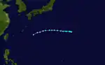 On July 31, JMA began monitoring a weak tropical depression that had developed in the Philippine Sea.[67] Later, PAGASA named Dindo to the storm.[68] By the next day, the Joint Typhoon Warning Center designated Dindo as 03W.[69] With favorable conditions of low vertical wind shear, strong equatorial outflow and 31 °C sea surface temperatures,[69] Dindo intensified into a tropical storm on midday of the same time, and the Japan Meteorological Agency named it as Hagupit.[70] Hagupit then began intensifying in the Philippine Sea, and by August 2, Hagupit was upgraded into a typhoon by the JTWC.[71] The JMA later upgraded Hagupit to a severe tropical storm late on August 2.[72] As Hagupit exited the Philippine Area of Responsibility (PAR), the PAGASA issued its final bulletin on the system.[73] Hagupit was then upgraded into typhoon status by the JMA on August 3,[74] and will later peak in intensity with a pressure of 975 hPa.[75] At around 19:30 UTC, Hagupit made landfall in Wenzhou, China, with winds of 85 mph and pressure of 975 mbar (hPa).[76] After its landfall, Hagupit gradually weakened over China, and by early August 4, the JTWC downgraded the typhoon into a tropical storm.[77] Around midday of the same day, JTWC downgraded Hagupit into a tropical depression and later issued their final advisories on the storm,[78] but the JMA still monitored Hagupit as a tropical storm.[79] The system later would undergo an extratropical transition, a process which got completed on August 6, and the JMA issued their final advisory on the extratropical Hagupit.[80]